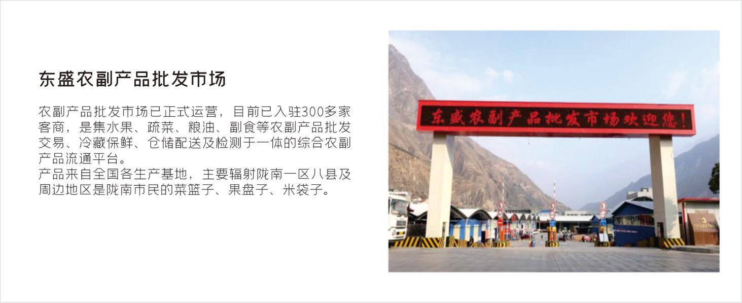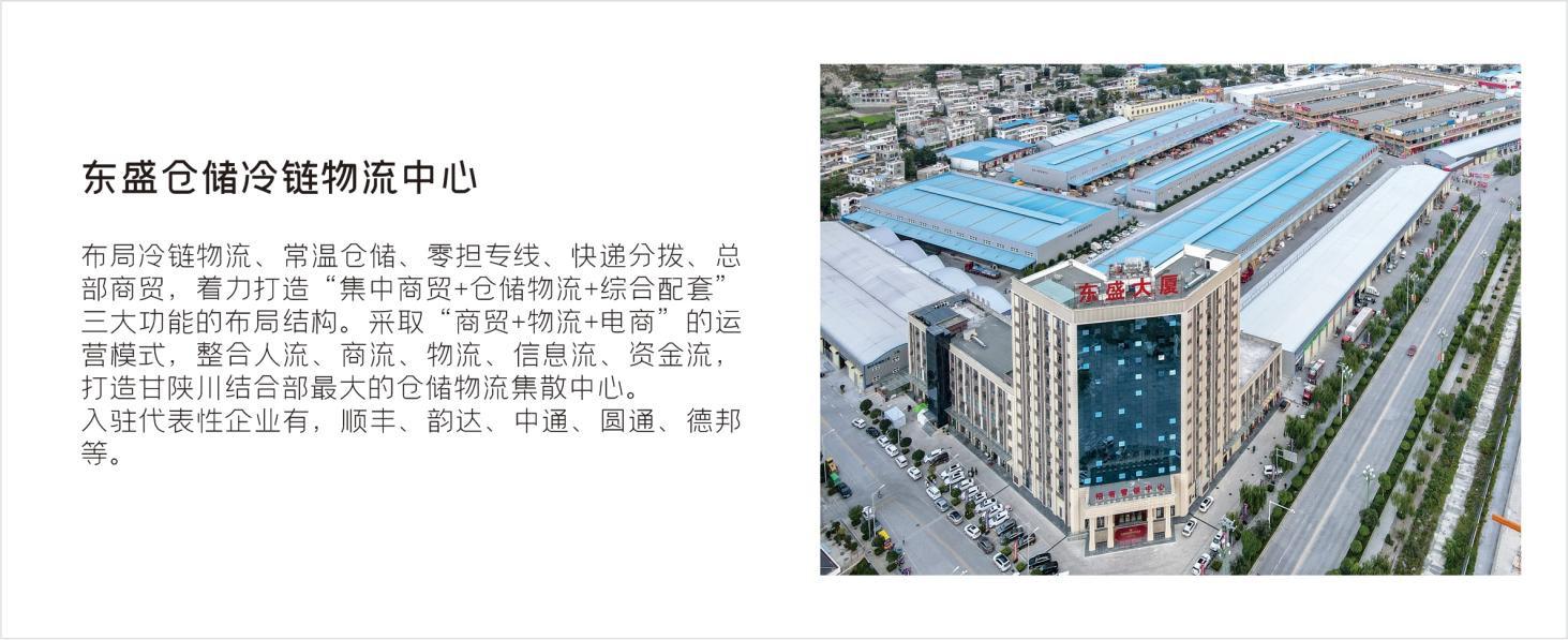 東盛物流運營的隴南東盛國際商貿(mào)物流港,定位集農(nóng)副產(chǎn)品、家居建材、五金機電、小商品小百貨、倉儲物流、電子商務、綜合配套于一體的現(xiàn)代商貿(mào)物流集散中心,項目占地370畝,總建筑面積48.5萬平方米,總投資17.31億元,截止2022年物流園區(qū)總交易額突破50億元。先后被授予“國家農(nóng)業(yè)農(nóng)村部定點市場”、“國家級商貿(mào)流通標準化試點企業(yè)”“甘肅省八大重點市場之一”、“甘肅省農(nóng)業(yè)產(chǎn)業(yè)化重點龍頭企業(yè)”。